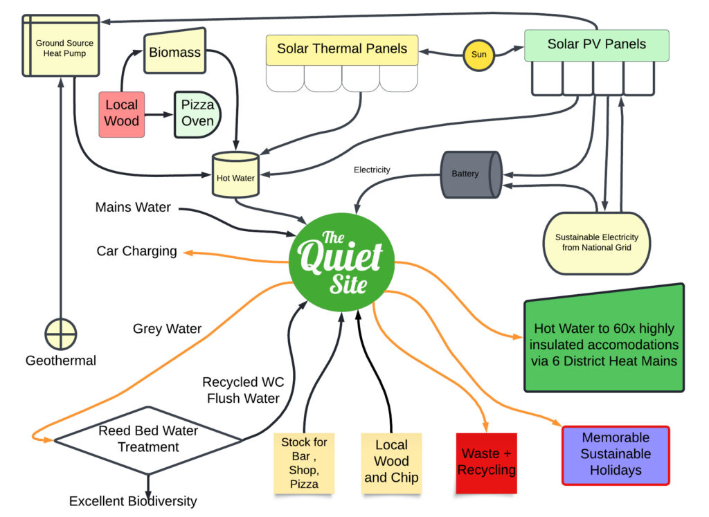 Heat pumps, triple insulated glamping units, solar PV, solar thermal, 6 district heat mains, a zero waste shop are just some of the projects we have completed to date. But you wont see rows of ugly solar panels in fields at The Quiet Site – we have integrated them into our existing buildings roofs so keeping everything pretty.