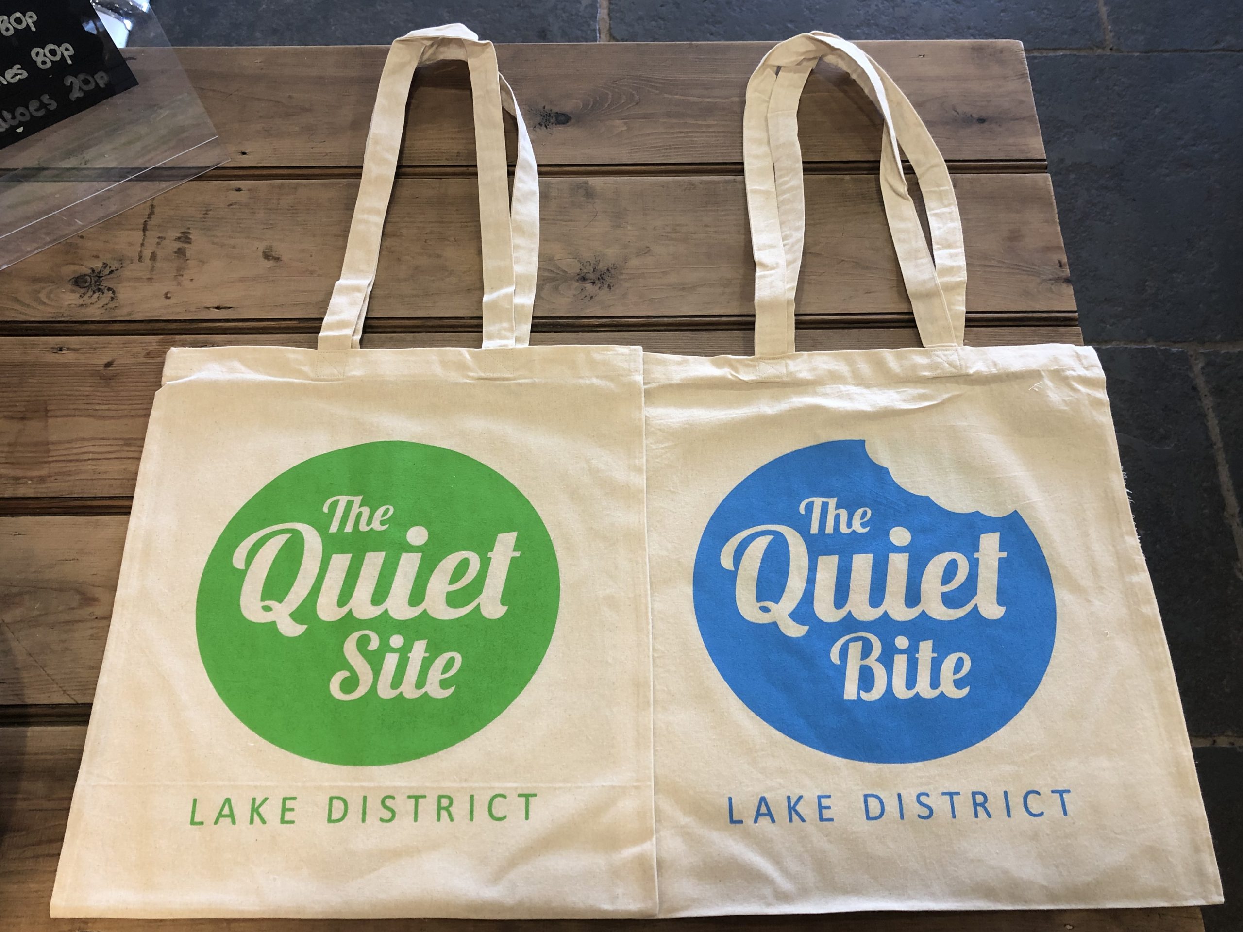 Quiet Site fabric tote bag, one side has the Quiet Site logo and on the other it has the Quiet Bite logo.